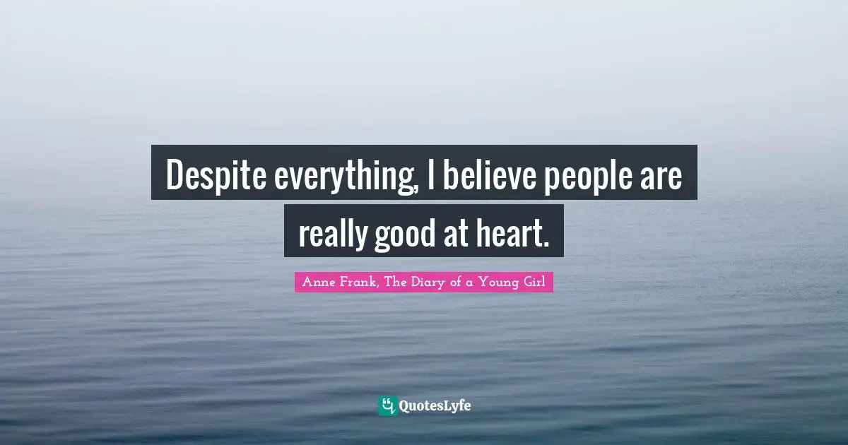 Anne Frank The Diary of a Young Girl Check all other quotes by Anne Frank The Diary of a Young Girl. Despite everything I believe people are really good at heart. In spite of everything I still believe that people are really good at heart.
