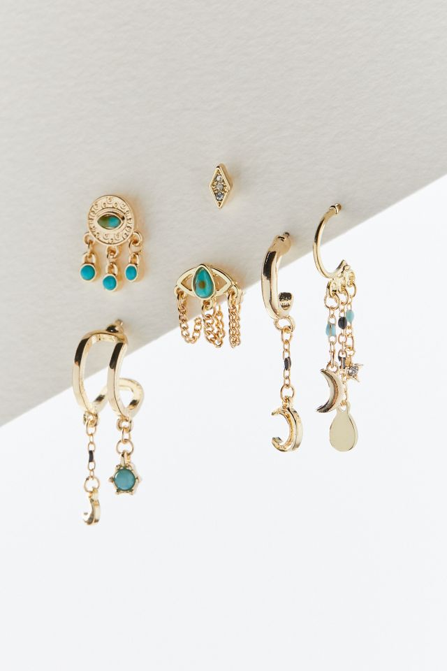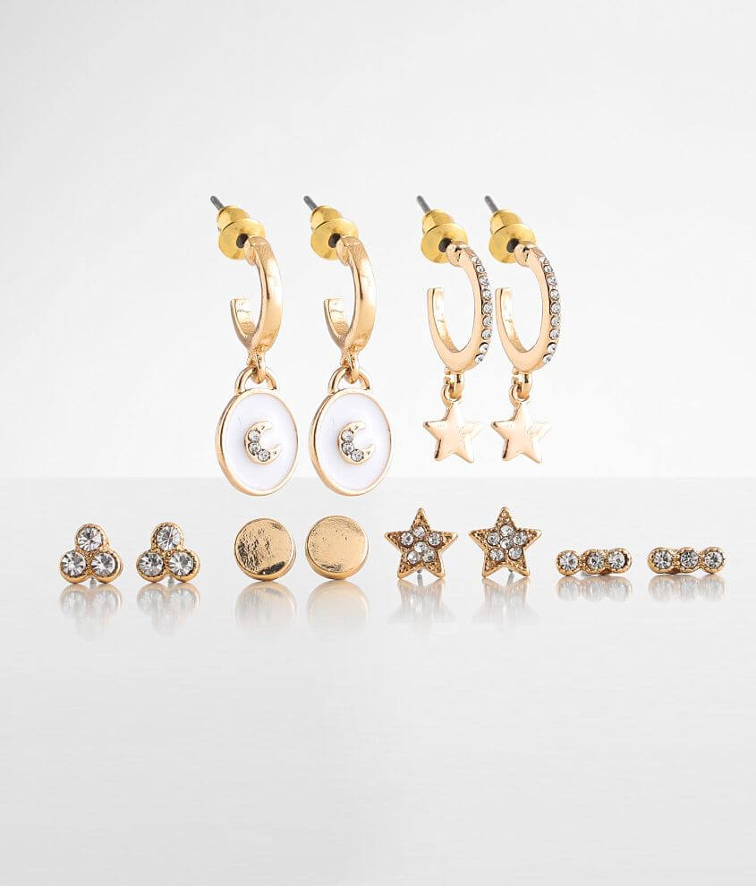 Shop the Celestial Earring Set at Anthropologie today. 9 pairs of goldtone studs and drops. This earring set will have you over the mood and reaching for the stars with its amazing variety of staple earrings that are ideal for everyday wear.